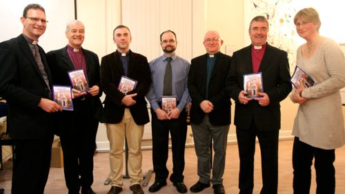 The Very Revd Kenny Hall, Dean of Clogher; the Most Revd Dr Michael Jackson, Archbishop of Dublin; the Revd Rob Clements, author; Symon Hill, who launched the booklet; the Revd Paddy McGlinchey, Lecturer in Missiology at CITI, the Right Revd John McDowell, Bishop of Clogher; and Dr Susan Hood, Church of Ireland Publications Officer.